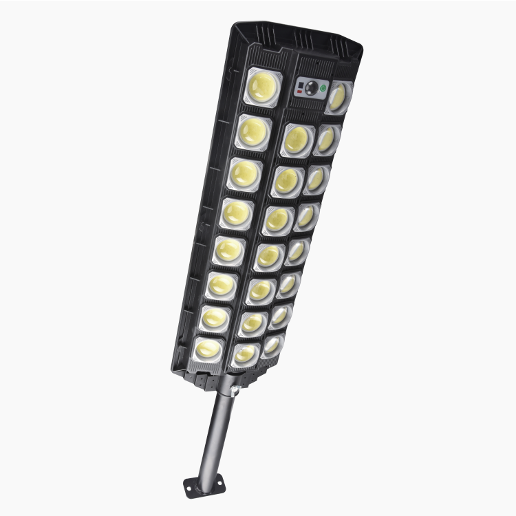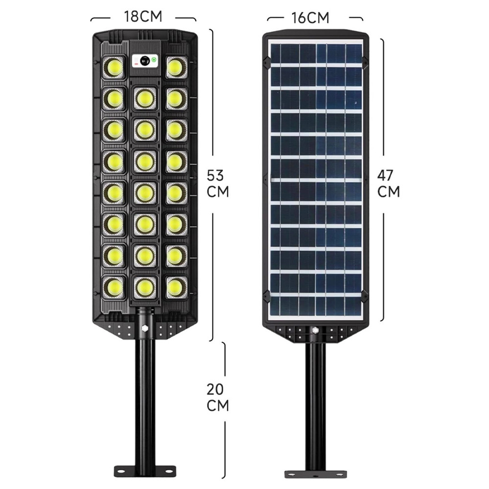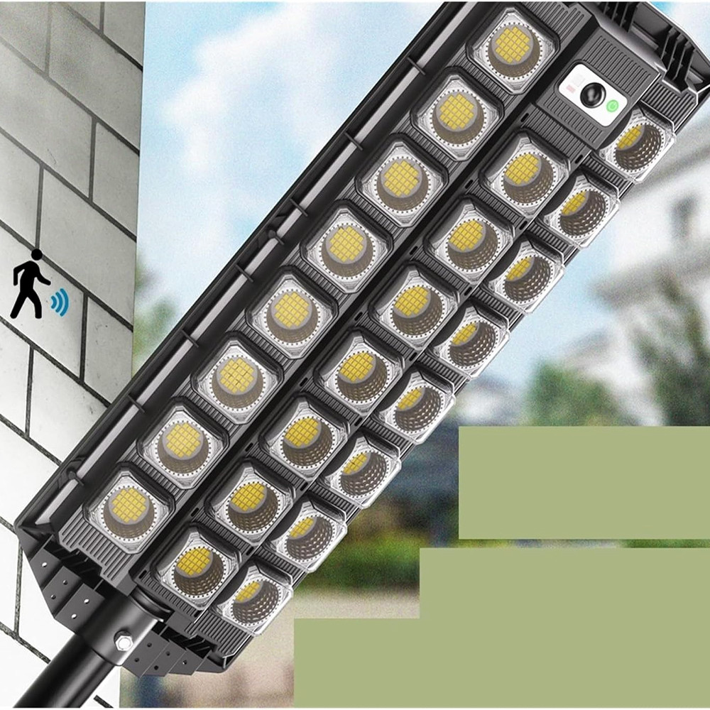 Lampă solară pentru exterior, destinată iluminării zonelor precum curți, alei sau terase. Funcționează pe bază de energie solară și este prevăzută cu senzori de lumină și mișcare.