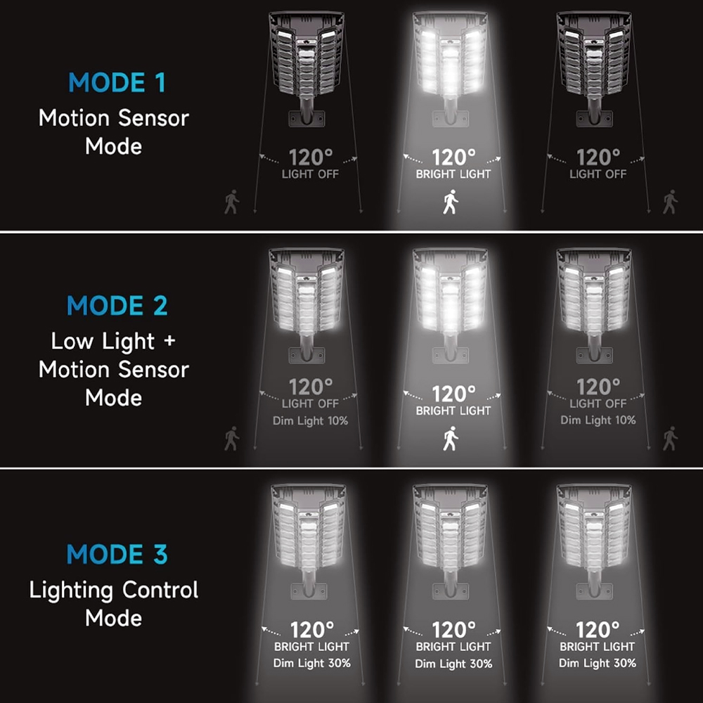 - Mod 2: iluminare redusă constantă, intensitate crescută la detectarea mișcării