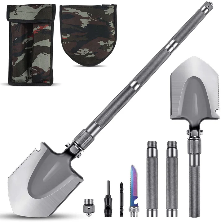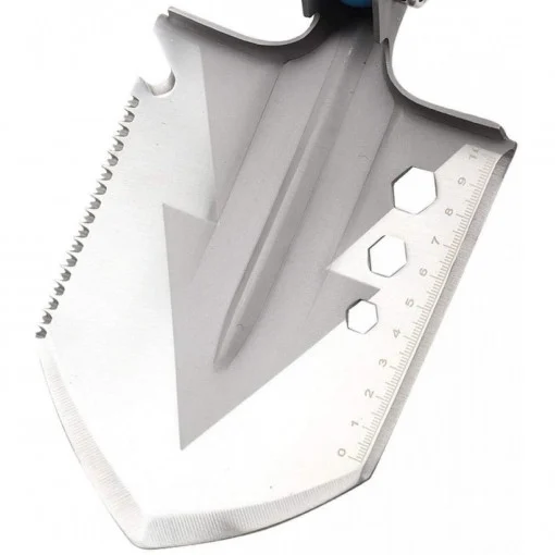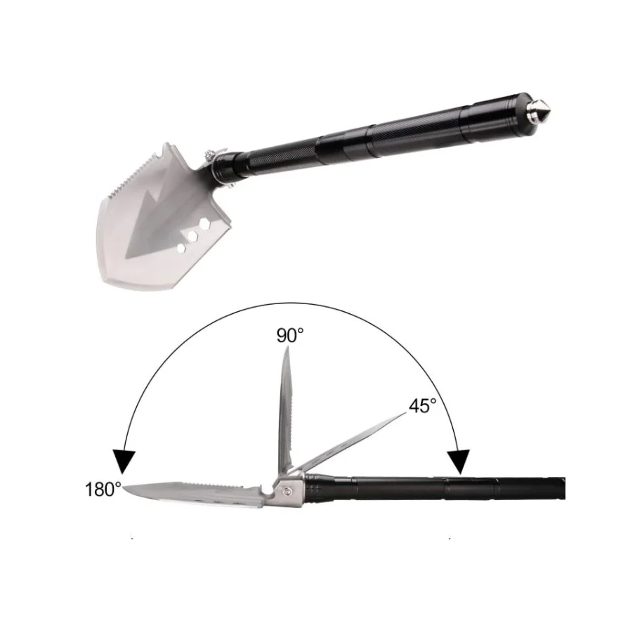 Lopată multifuncțională pliabilă, realizată din oțel mangan, destinată utilizării în activități outdoor, gospodărești sau situații diverse. Designul compact permite transportul facil și depozitarea în spații reduse.