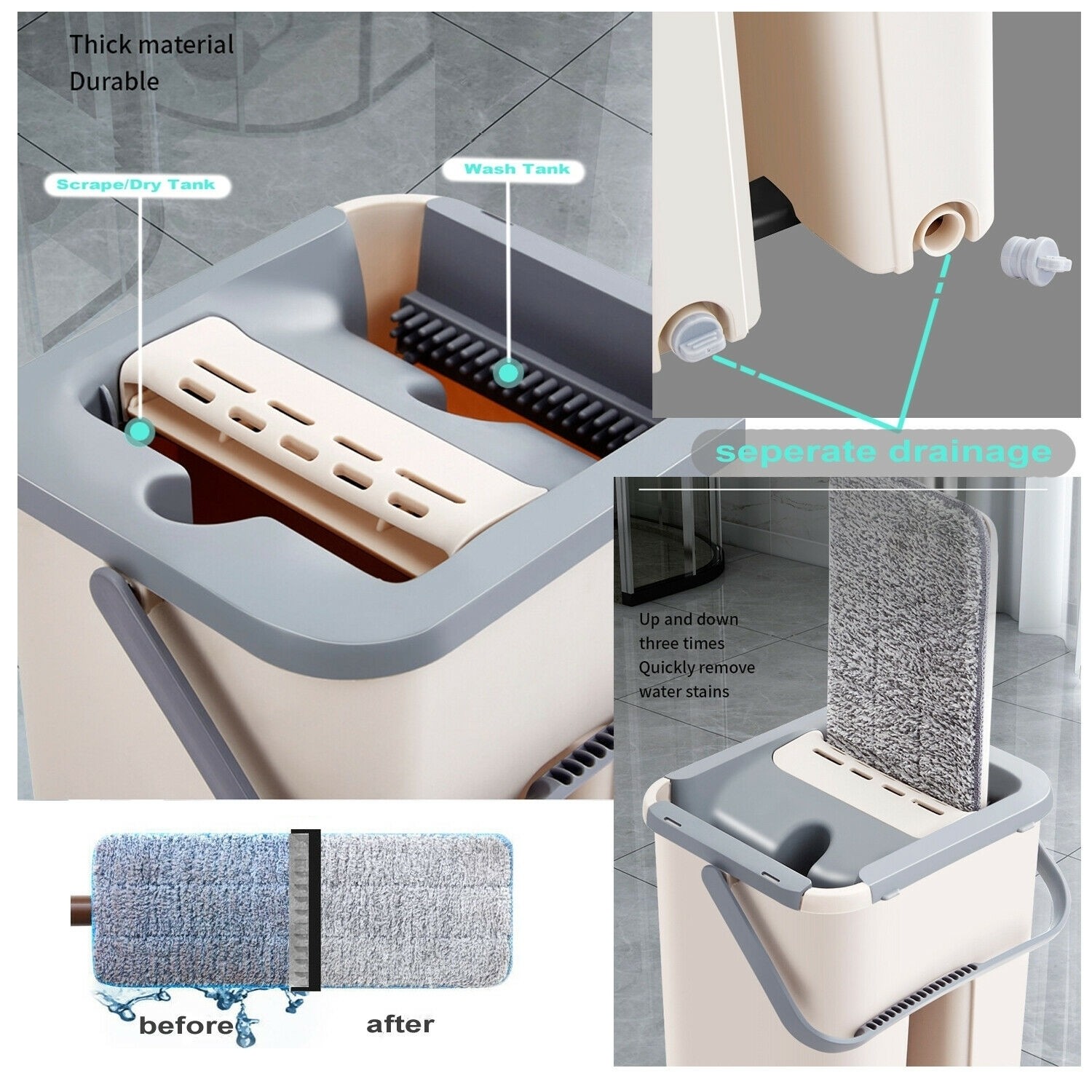 Mopul profesional cu două cuve permite spălarea și uscarea rapidă a podelelor. Designul rotativ la 360° facilitează curățarea colțurilor și a spațiilor înguste. Capul de mop din microfibră este moale, rezistent la zgârieturi și previne scamele și mirosurile.