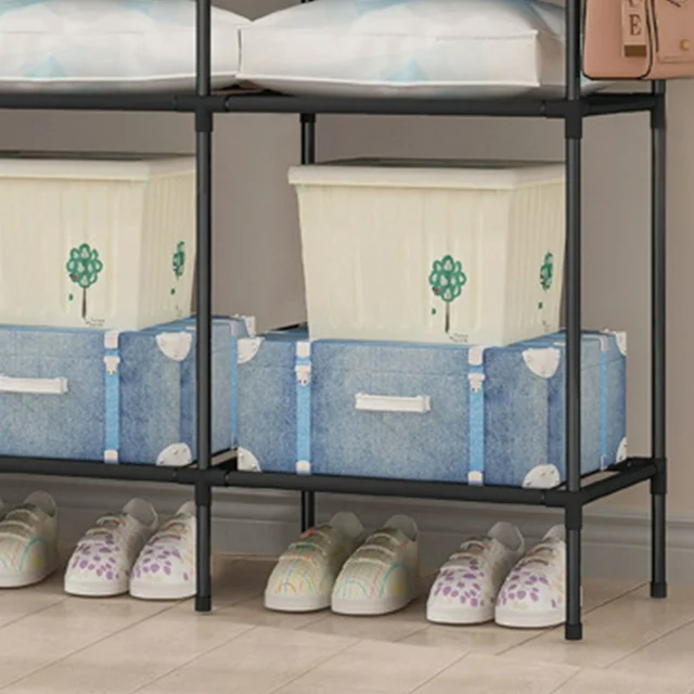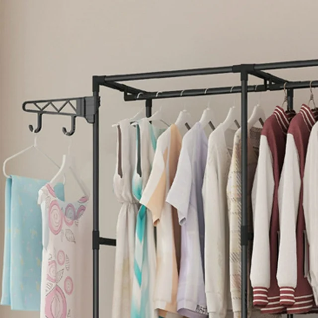 Acest suport pentru haine oferă spațiu pentru organizarea articolelor de îmbrăcăminte, încălțăminte și accesorii. Construcția include trei bare pentru atârnarea hainelor și trei rafturi care pot fi utilizate pentru depozitarea pantofilor, cutiilor sau a altor obiecte. Cârligele laterale permit agățarea genților sau a eșarfelor.