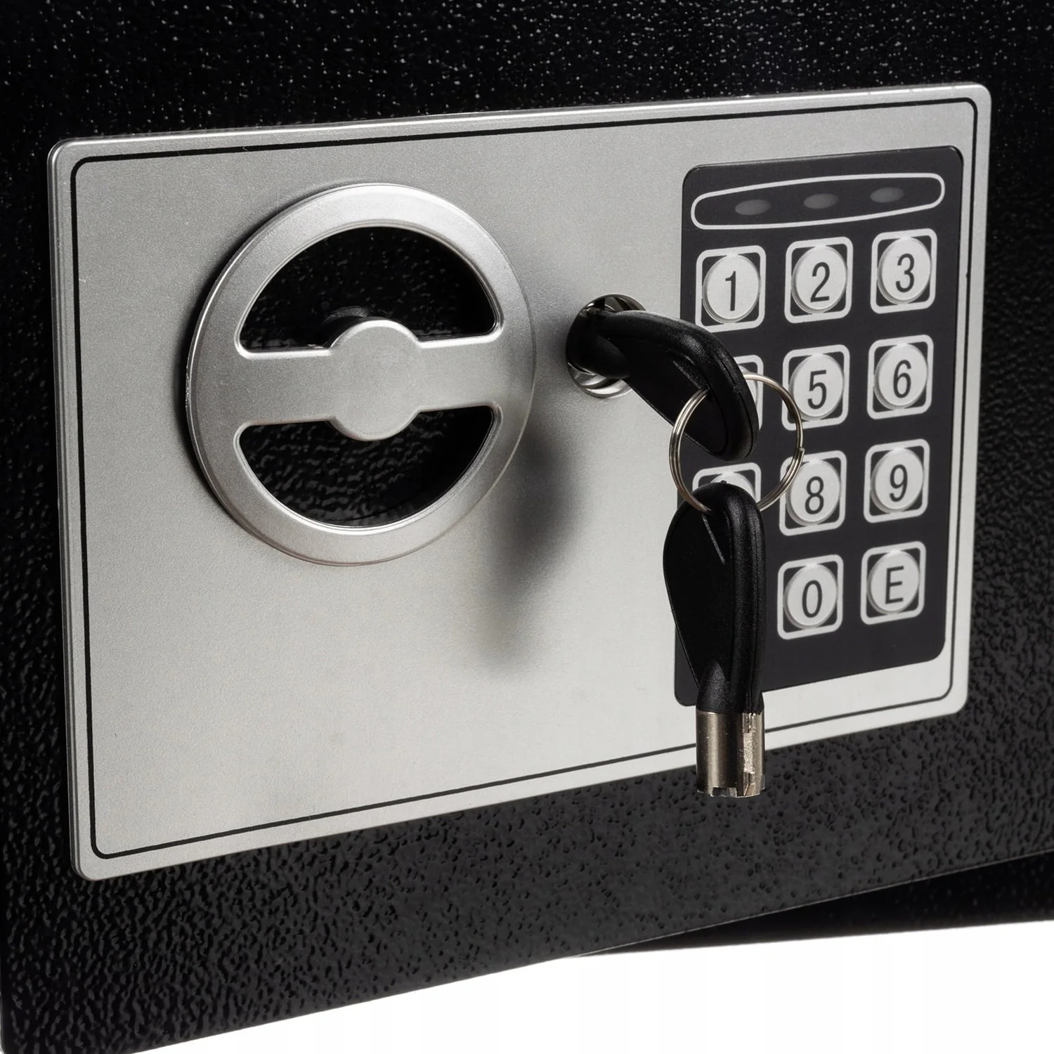 Seiful este realizat din oțel rezistent și este prevăzut cu sistem de închidere cu cifru digital, care permite setarea unui cod personalizat pentru acces rapid și sigur. În plus, produsul include două chei de urgență, utile în cazul în care codul nu poate fi utilizat.