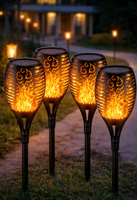 Lampa solară tip torță cu efect flacără este o soluție decorativă pentru iluminarea gradinilor, aleilor, scărilor, gardurilor, curții sau intrării în locuință